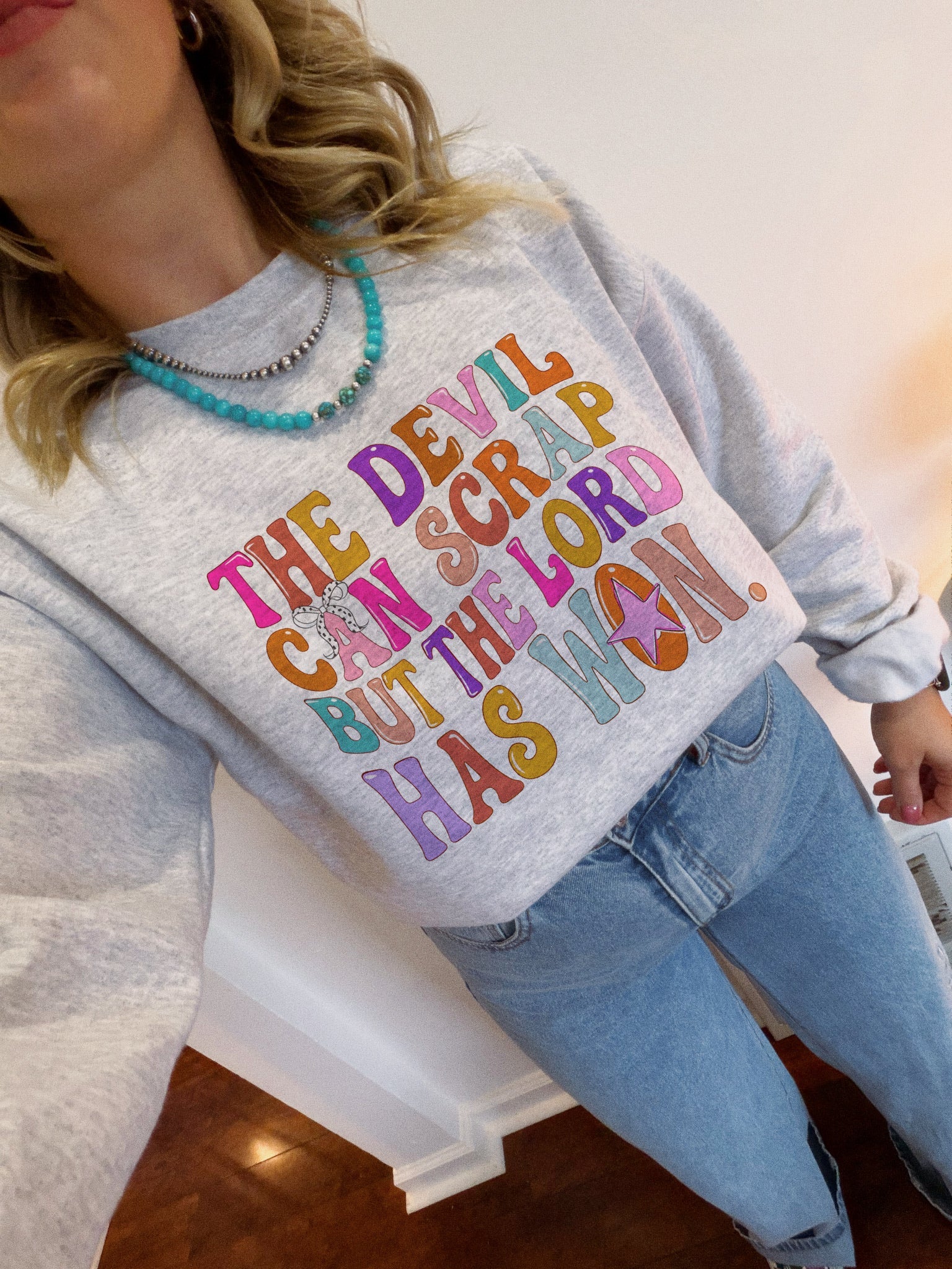 Lord has Won by Walking A provides a unisex fit on an ash, white, or sand tee or crew.
