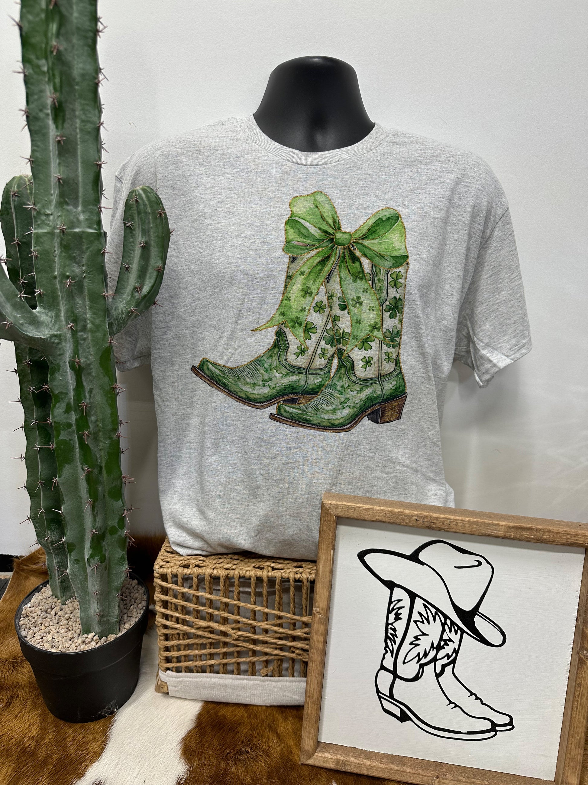Lucky Boots by Walking A provides a unisex fit on an ash, white, or sand tee or crew.