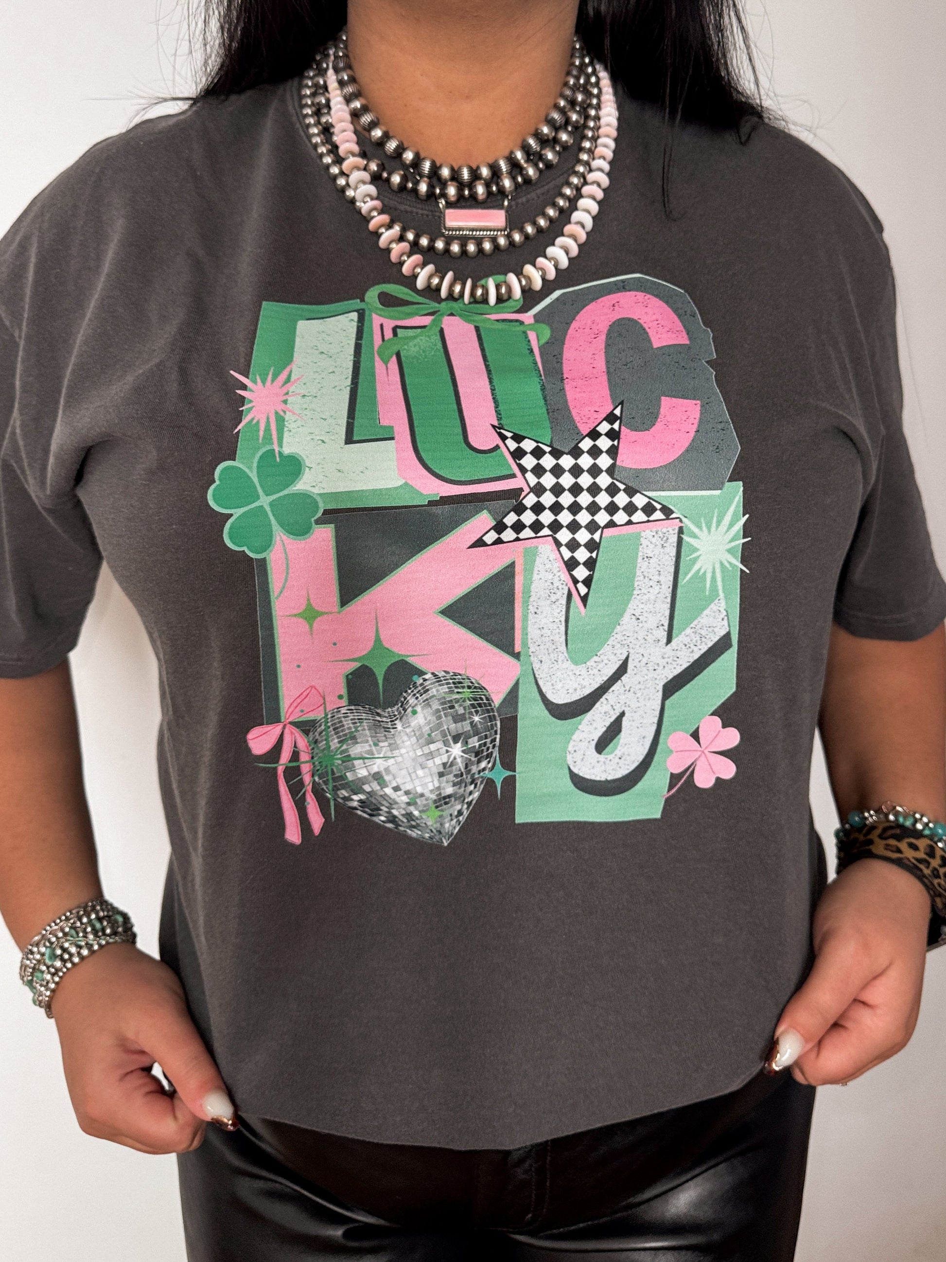 Lucky Collage provides a unisex fit on a Pepper Comfort Colors Tee.