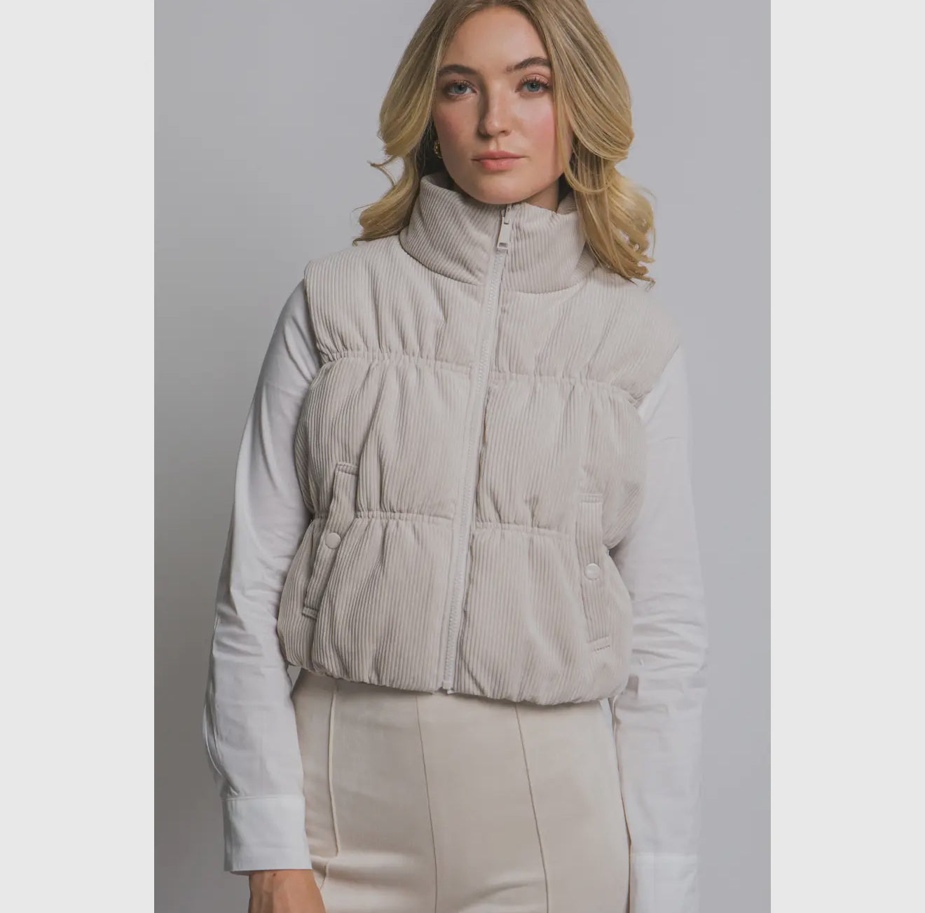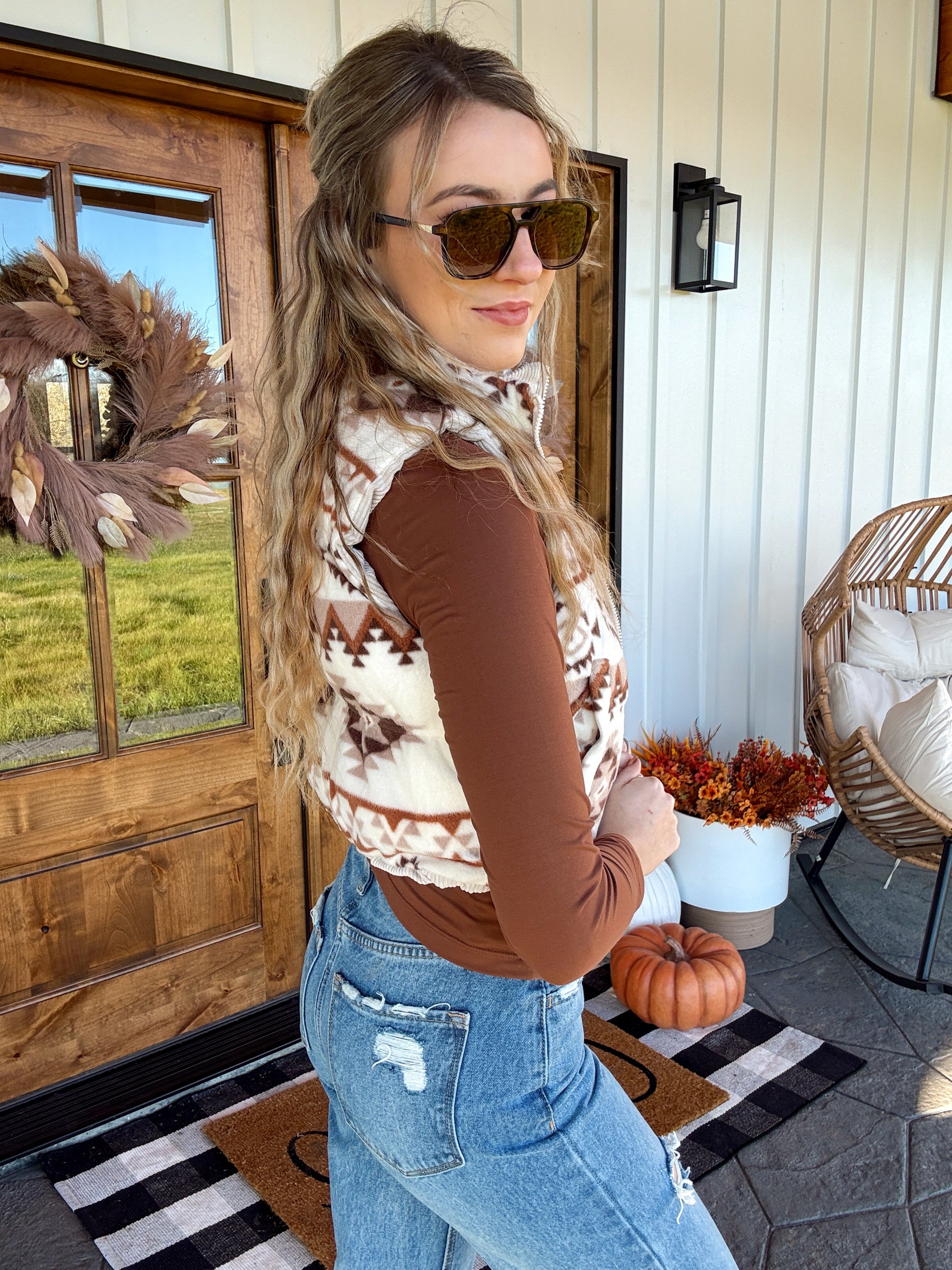 Elevate your winter layering with this reversible puffer vest featuring a plush corduroy exterior on one side and a vibrant aztec inspired fleece print on the other