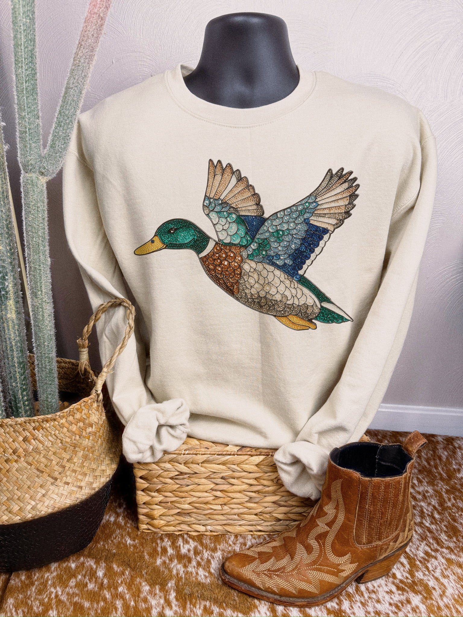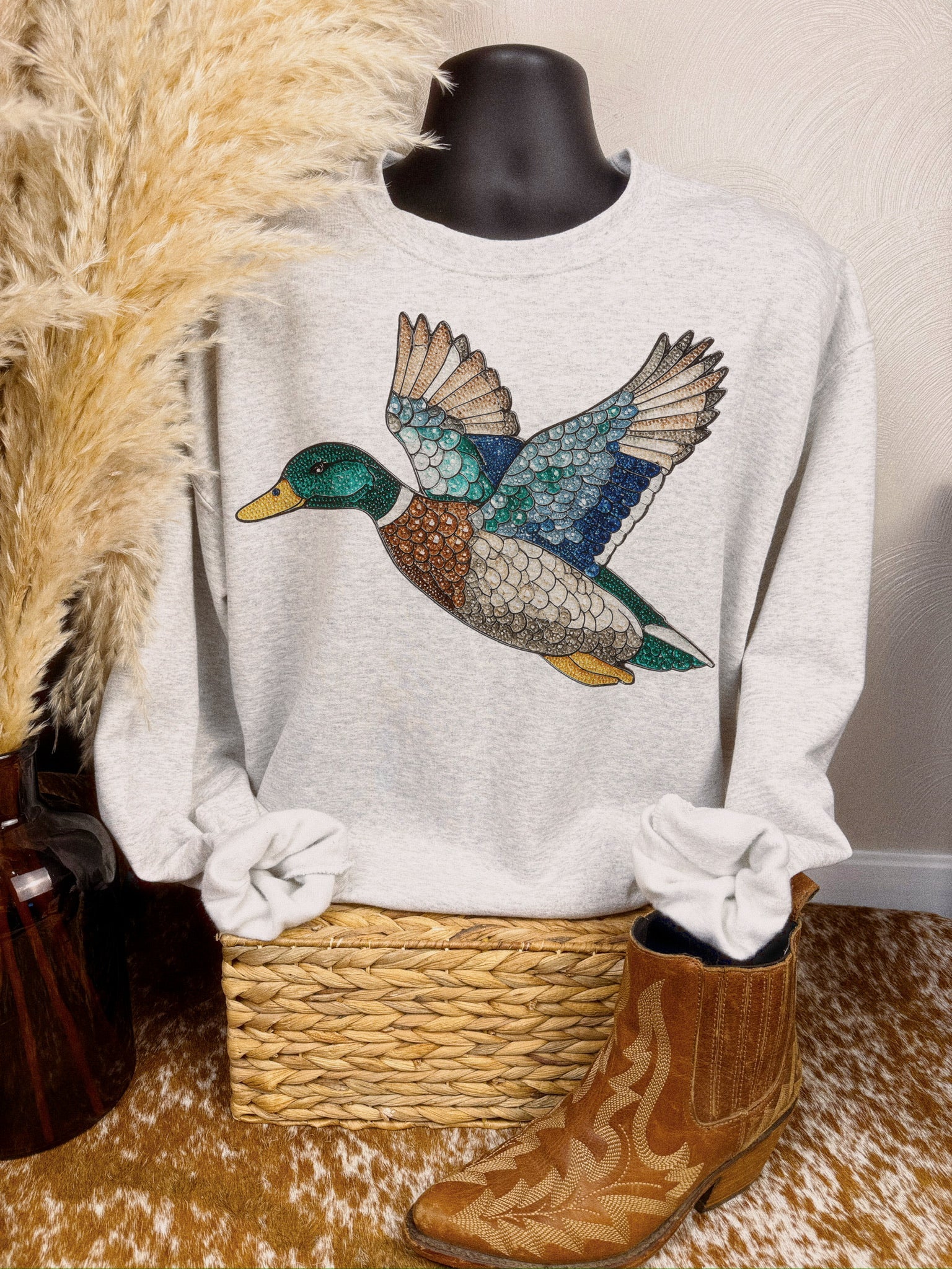 Stained Glass Mallard, by Walking A provides a unisex fit on an ash, white, or sand tee or crew.