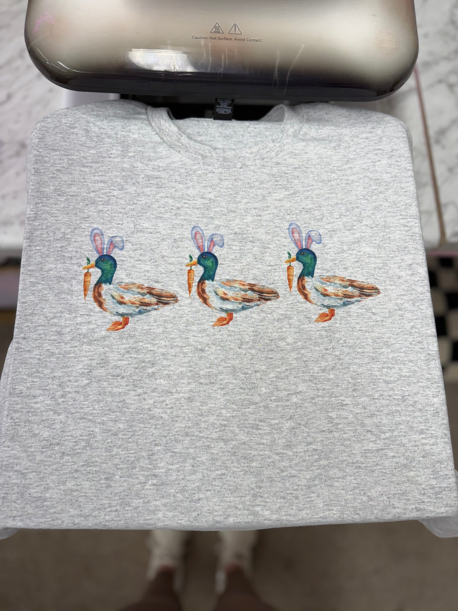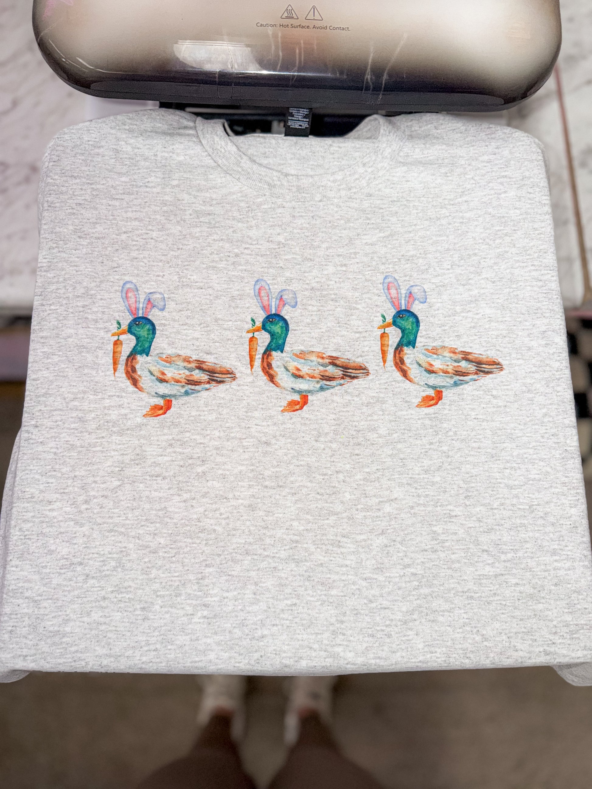 The Bunny Mallard by Walking A provides a unisex fit on an ash, white, or sand tee or crew.