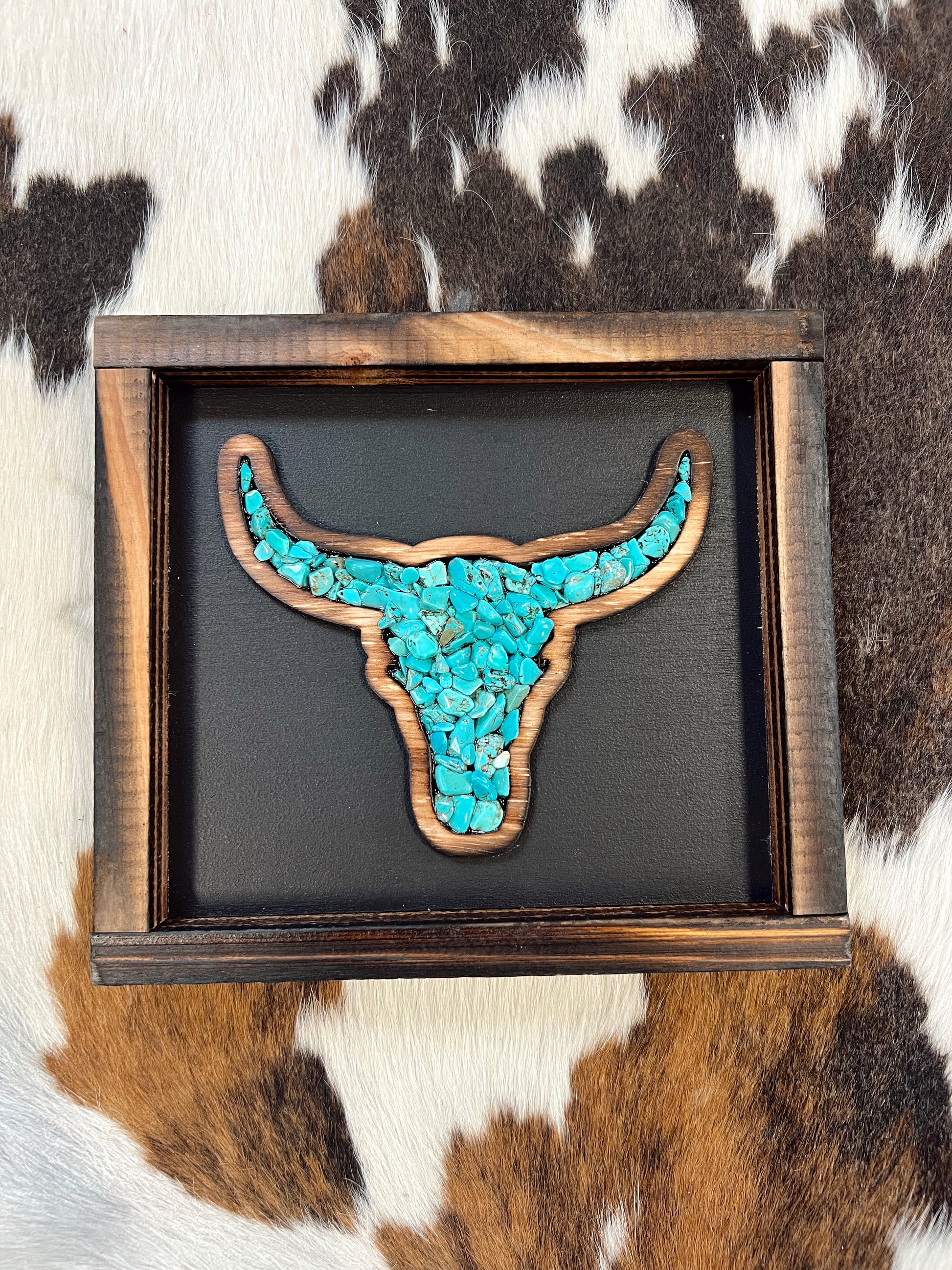 This Western bull skull decor is a unique addition to any western-style home. The turquoise colored bullskull provides a pop of color to any room, and is a great way to incorporate a touch of the wild west into your interior design.